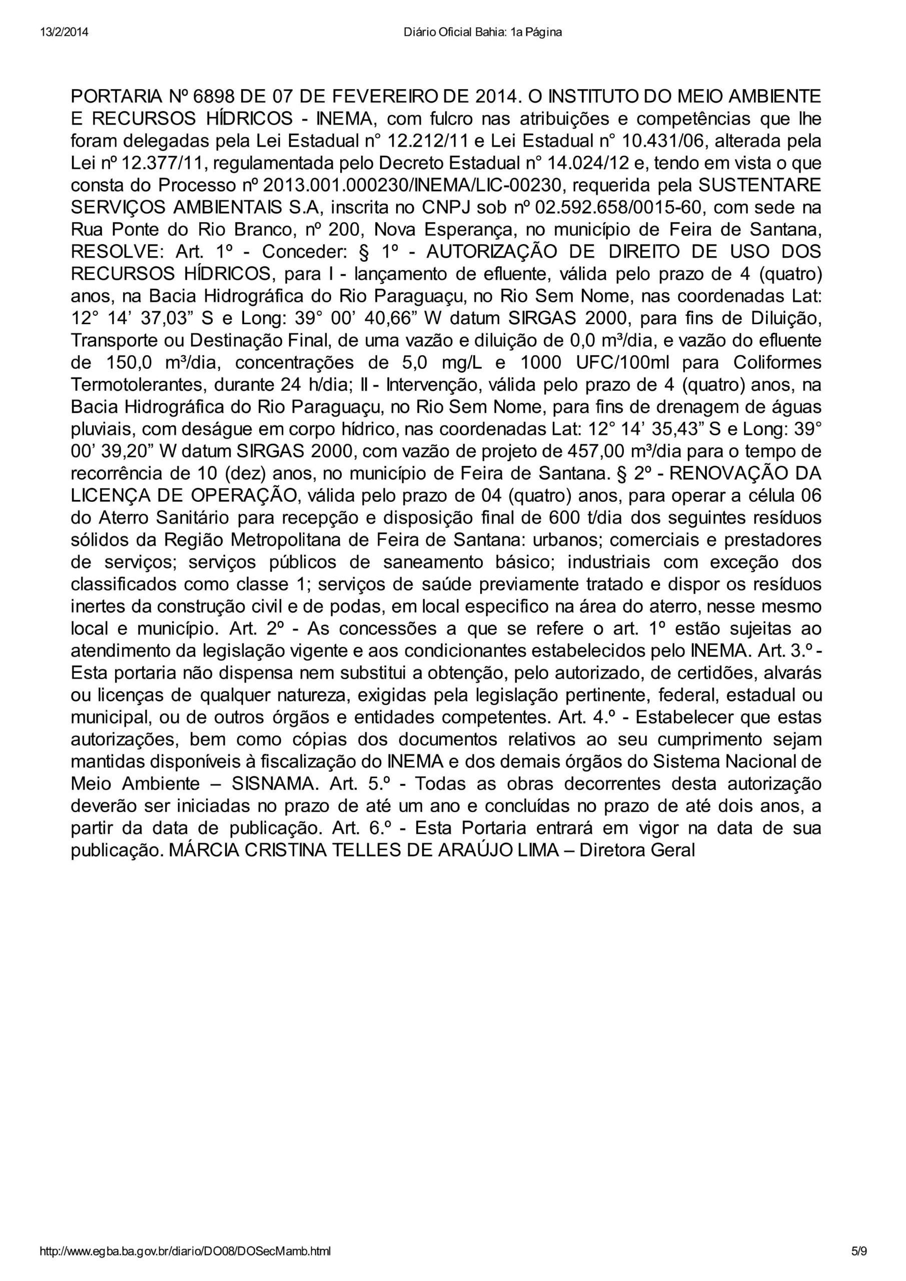 Portaria 6898 emitida pelo INEMA concede LO a Sustentare, e autoriza a contaminação do Riacho das Três Panelas e do Rio Jacuípe.