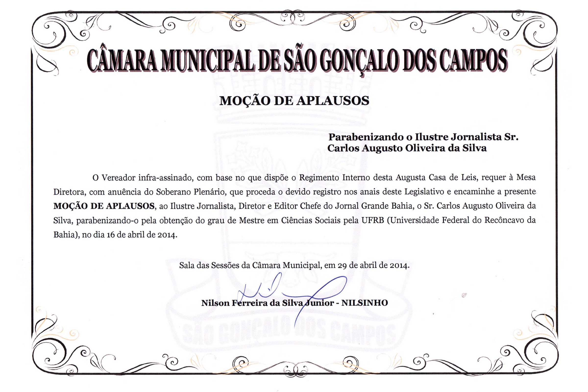 Por iniciativa do vereador Nilson Ferreira da Silva Junior (Nilsinho), a Câmara Municipal de São Gonçalo dos Campos (CMSGC) aprovou ‘Moção de Aplausos’, para o diretor e editor do jornal Grande Bahia, Carlos Augusto Oliveira da Silva (Carlos Augusto). A ‘Moção’ foi aprovada em sessão ordinária, por unanimidade, realizada no dia 29 de abril de 2014, sendo registrada através do Ofício nº 115/2014.
