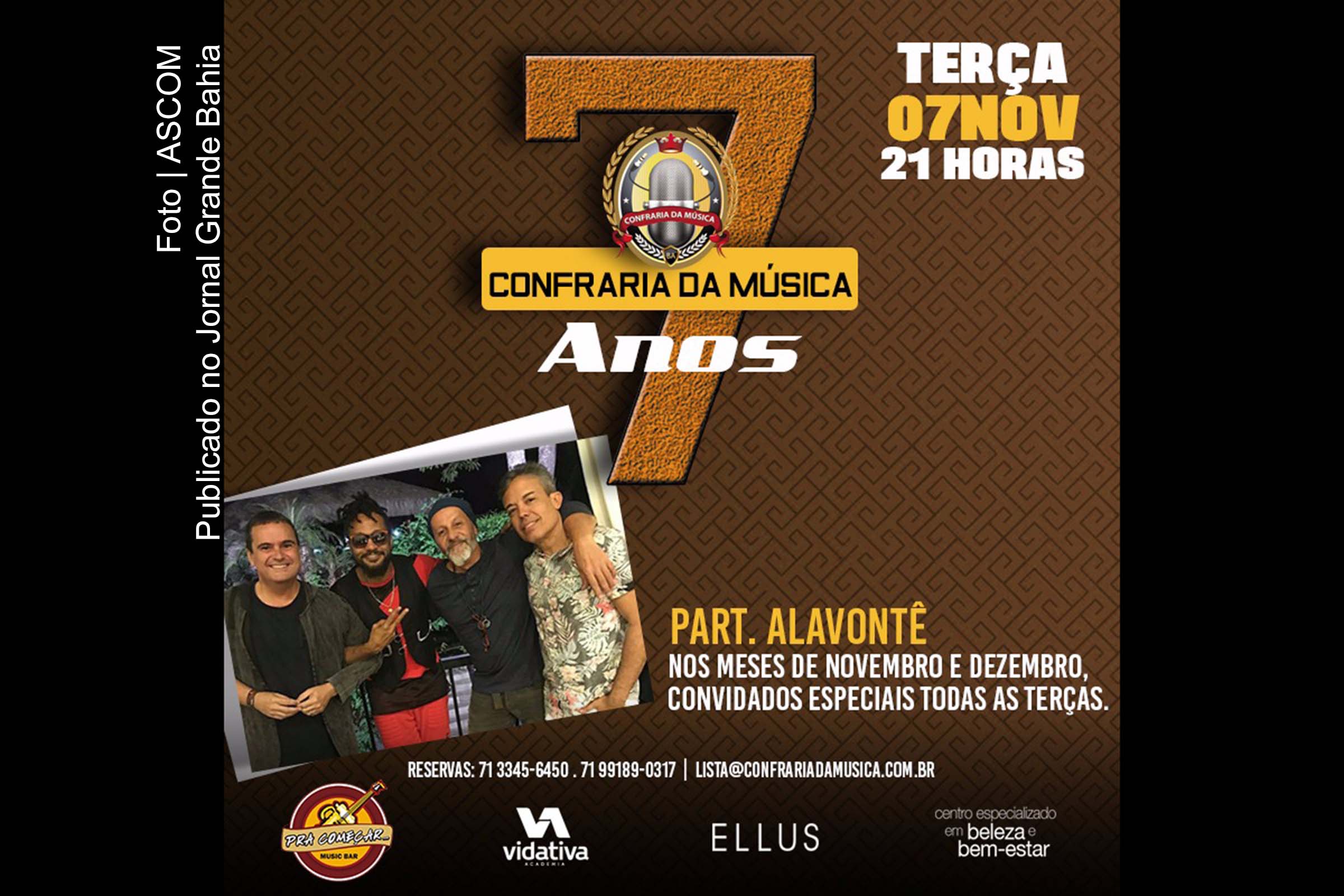 Nos meses de novembro e dezembro de 2017, a Confraria da Música comemora 7 anos de projeto. Para celebrar à altura, os cantores e compositores Alex Góes, Alvaro Pinho, Eva Cavalcante e Rafa Chaves convidaram nomes especiais da música baiana – que fazem jus à diversidade que representa bem o perfil da Confraria – para dividirem com eles o palco do Pra Começar Music Bar, em Salvador. Já estão confirmadas as cantoras Marcia Short, Clariana Fróes, Renata Bastos e o cantor Paulinho Boca (Novos Baianos). E, para abrir a temporada de celebração, nessa terça (07/11/2017), os confrades recebem o Movimento Musical Alavontê, que conta na sua formação atual com Ricardo Chaves, Magary Lord, Jonga Cunha e Ramon Cruz.