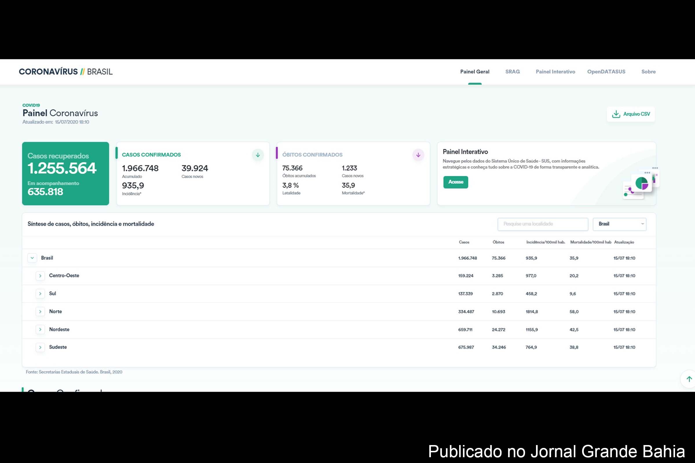 O Brasil chegou a 1.966.748 de casos confirmados acumulados de Covid-19 e o total de 75.366 óbitos desde o início da pandemia do novo coronavírus. O número foi divulgado na atualização diária do Ministério da Saúde nesta quarta-feira (15/07/2020), durante entrevista coletiva no Palácio do Planalto.