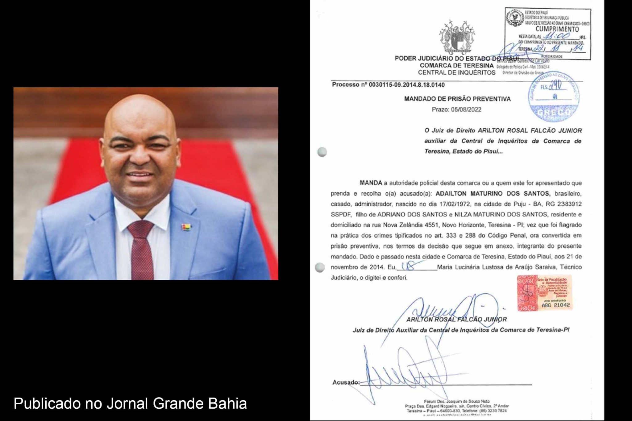 Em 21 de novembro de 2014, o juiz de Direito da Comarca de Teresina Arilton Rosal Falção Junior expediu Mandado de Prisão Preventiva, no âmbito do Processo nº 0030115-09.2014.8.18.0140, contra Adailton Maturino dos Santos.