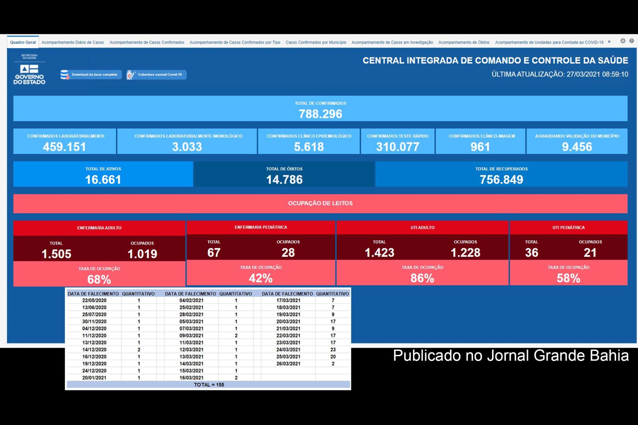 • Bahia tem novo recorde de óbitos por Covid-19 registrados em 24 horas