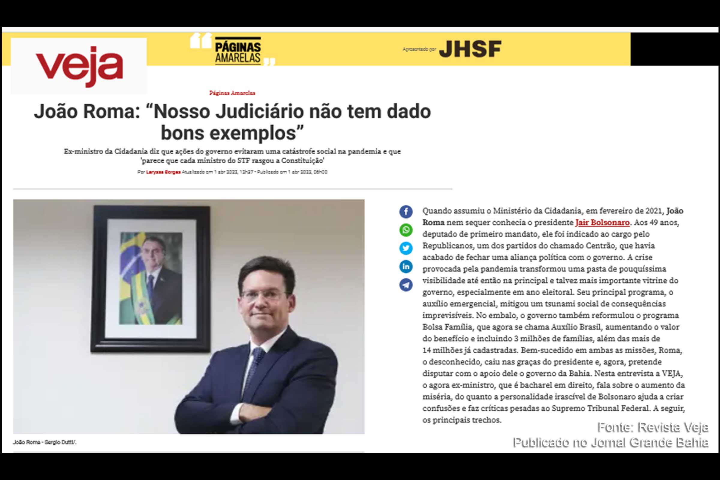 Em entrevista às páginas amarelas da revista Veja, desta semana, o recém desincompatibilizado ministro da Cidadania considera que a polarização nacional entre o presidente Jair Bolsonaro (PL) e o ex-presidente Lula se reproduzirá na disputa eleitoral baiana. “Eu sou o único opositor ao governo petista do estado”, diz o deputado federal João Roma (PL). Político é ex-partidário do Republicanos e ex-aliado de ACM Neto (UB).