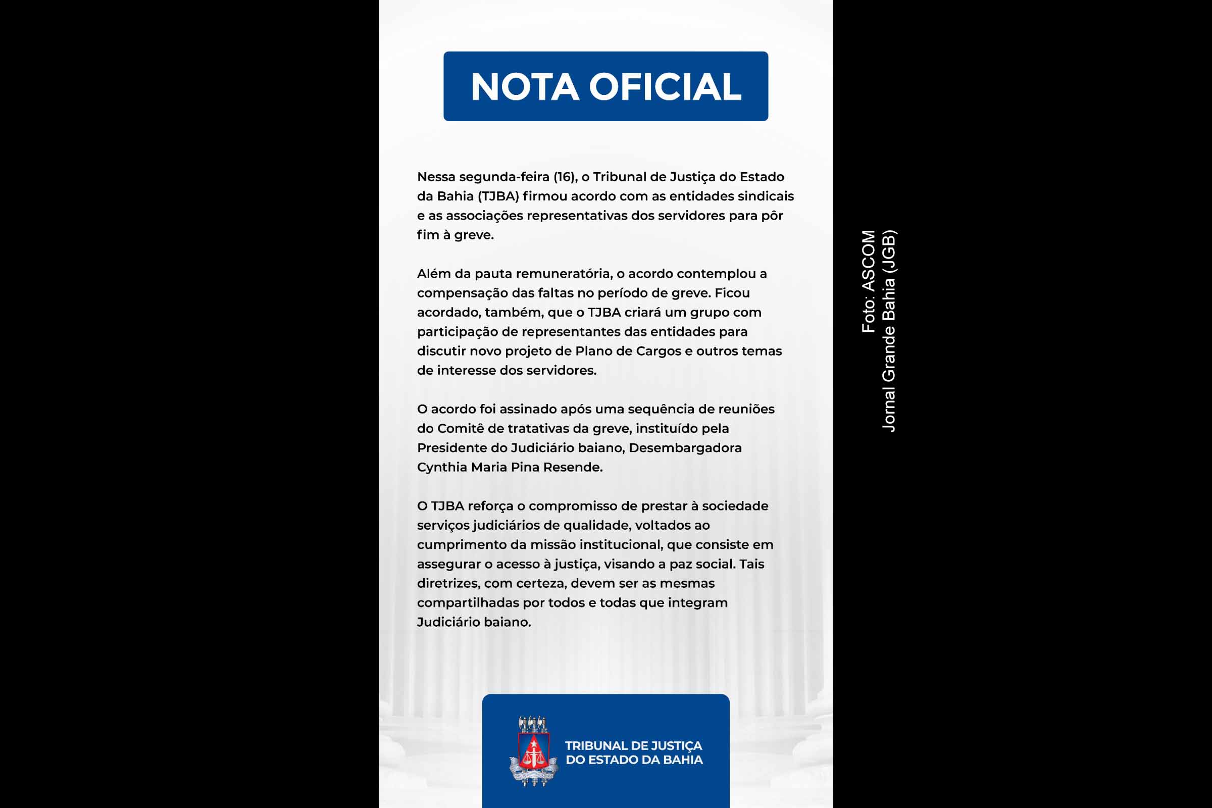 Em nota oficial, o TJBA reafirmou o compromisso com a sociedade baiana de oferecer serviços judiciais de qualidade, em consonância com sua missão institucional de assegurar o acesso à Justiça e promover a paz social. O tribunal também reforçou a importância de que essas diretrizes sejam compartilhadas por todos os integrantes do Judiciário baiano, como forma de fortalecer o papel do Poder Judiciário na garantia de direitos fundamentais.