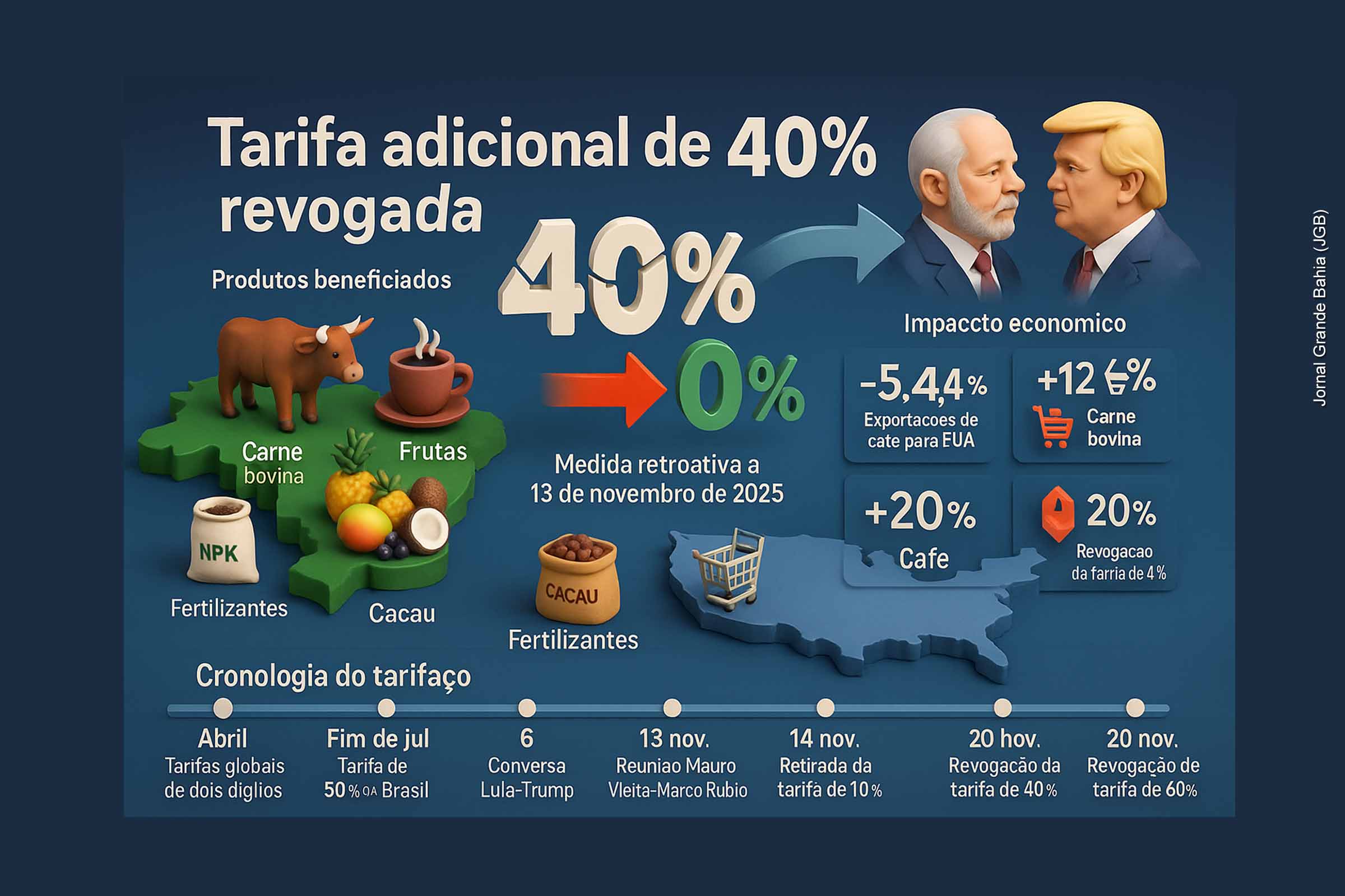 O presidente dos Estados Unidos, Donald Trump, assinou nesta quinta-feira (20/11/2025) ordem executiva que revoga a tarifa adicional de 40% aplicada desde julho a mais de 200 produtos agrícolas e pecuários do Brasil, incluindo carne bovina, café, frutas tropicais, cacau, fertilizantes e partes aeronáuticas. A medida, com efeito retroativo a 13 de novembro, ocorre após “progresso inicial nas negociações” com o governo brasileiro e em meio à alta da inflação de alimentos nos EUA, pressionando a Casa Branca a aliviar o tarifaço global.