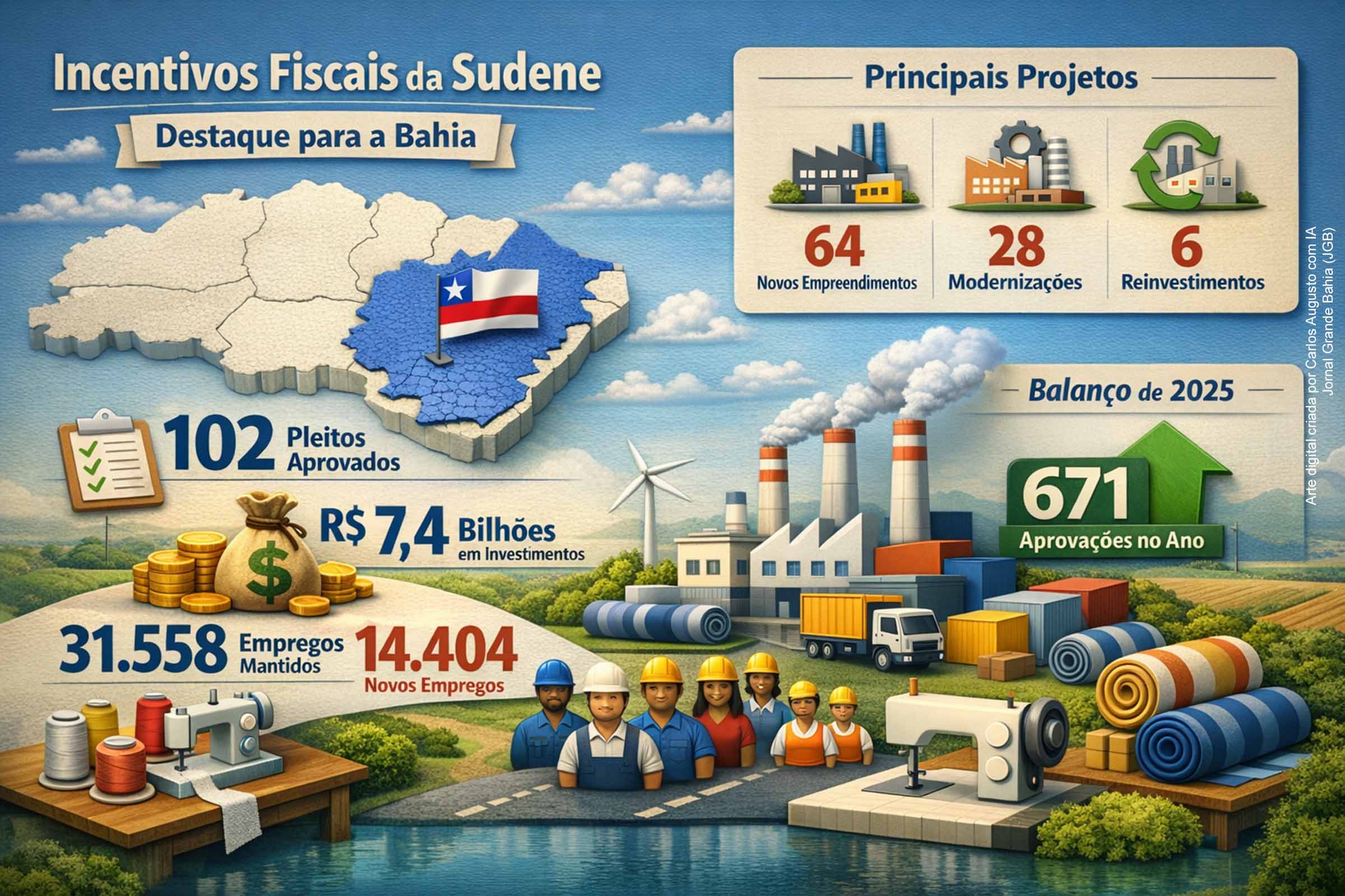 A Sudene aprovou, em reunião da diretoria colegiada realizada nesta terça-feira (30/12/2025), 102 pleitos de incentivos fiscais apresentados por empresas instaladas em sua área de atuação. As decisões abrangem projetos de implantação de novos empreendimentos, modernização de unidades produtivas, diversificação de linhas de produção e reinvestimentos, com impacto direto na manutenção de 31.558 empregos, dos quais 14.404 correspondem a novos postos de trabalho. A Bahia concentrou o maior número de aprovações, consolidando-se como principal beneficiária do conjunto de medidas.