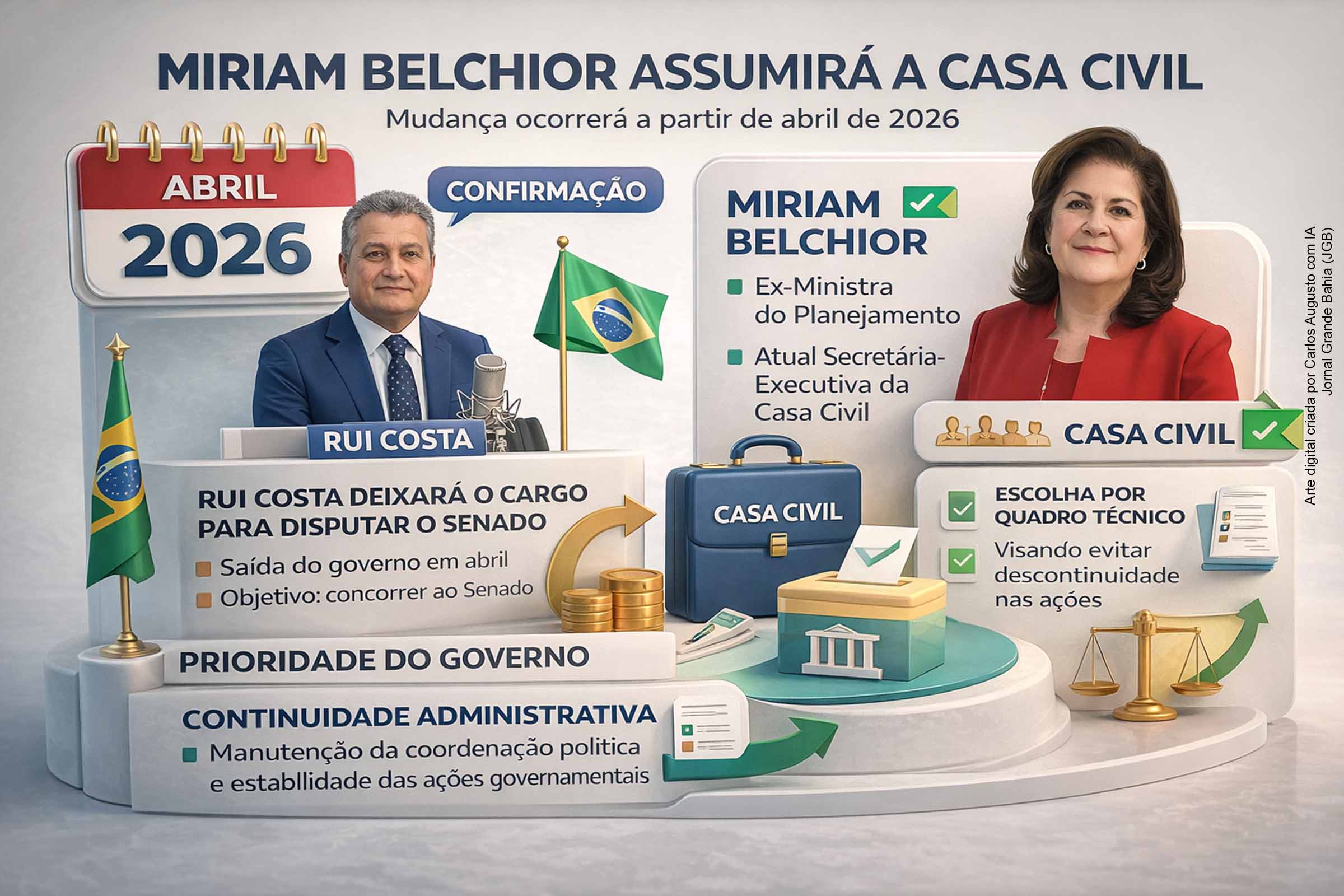 Em entrevista concedida na manhã desta quinta-feira (29/01/2026) à Rádio 95 FM, de Jequié, o ministro da Casa Civil, Rui Costa, confirmou que a atual secretária-executiva da pasta, Miriam Belchior, foi indicada pelo presidente Luiz Inácio Lula da Silva para sucedê-lo no cargo a partir de abril. A mudança ocorre em meio ao planejamento do ministro para deixar o governo e disputar uma vaga no Senado nas eleições de 2026, e tem como diretriz central assegurar continuidade administrativa e estabilidade das ações governamentais.