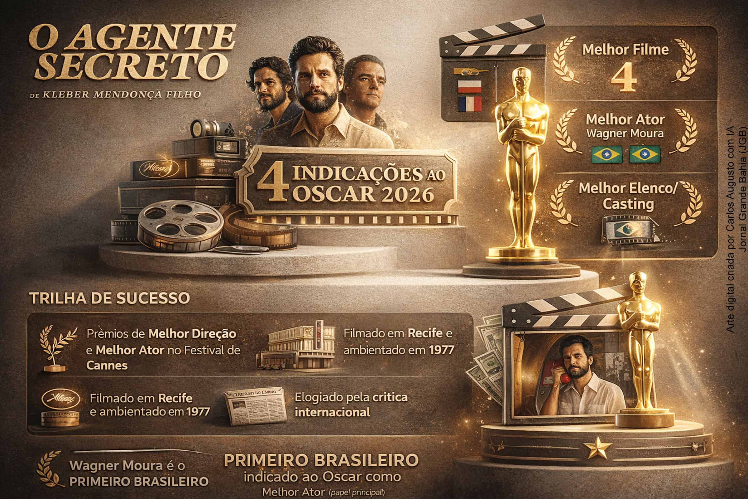 No embalo de uma trajetória rara para o cinema nacional, “O Agente Secreto”, de Kleber Mendonça Filho, transformou prestígio de festival em campanha global: após a estreia na competição oficial de Cannes e vitórias relevantes no circuito, o longa chegou ao anúncio do Oscar 2026 com quatro indicações, incluindo Melhor Filme e Melhor Ator para Wagner Moura, nascido em Salvador (BA). A lista oficial de indicados, divulgada em 22 de janeiro de 2026, confirmou o filme também em Melhor Filme Internacional (representando o Brasil) e Melhor Elenco/Casting.