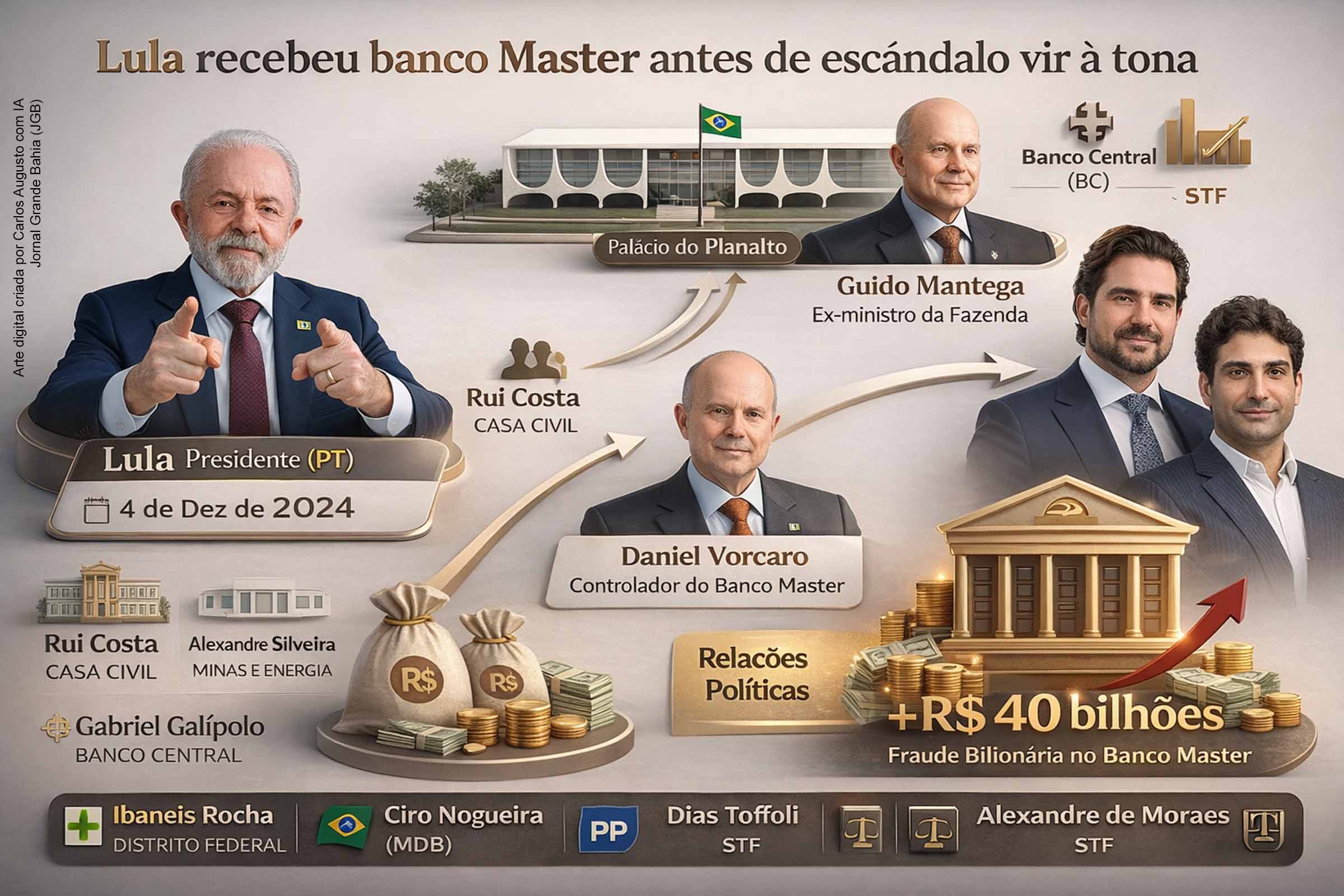 O presidente Luiz Inácio Lula da Silva recebeu no Palácio do Planalto, em 4 de dezembro de 2024, o empresário Daniel Vorcaro, controlador do Banco Master, semanas antes de o escândalo envolvendo suspeitas de fraude financeira vir a público. A reunião ocorreu a pedido do ex-ministro da Fazenda Guido Mantega, que acompanhava Vorcaro, e contou com a presença de autoridades do governo e do sistema financeiro. O episódio ganhou relevância após a revelação das conexões políticas do banqueiro e do avanço das investigações, que hoje atingem o Judiciário, o Banco Central e lideranças partidárias, revelou Mariana Brasil e Caio Spechoto, em reportagem no jornal Folha de S.Paulo.