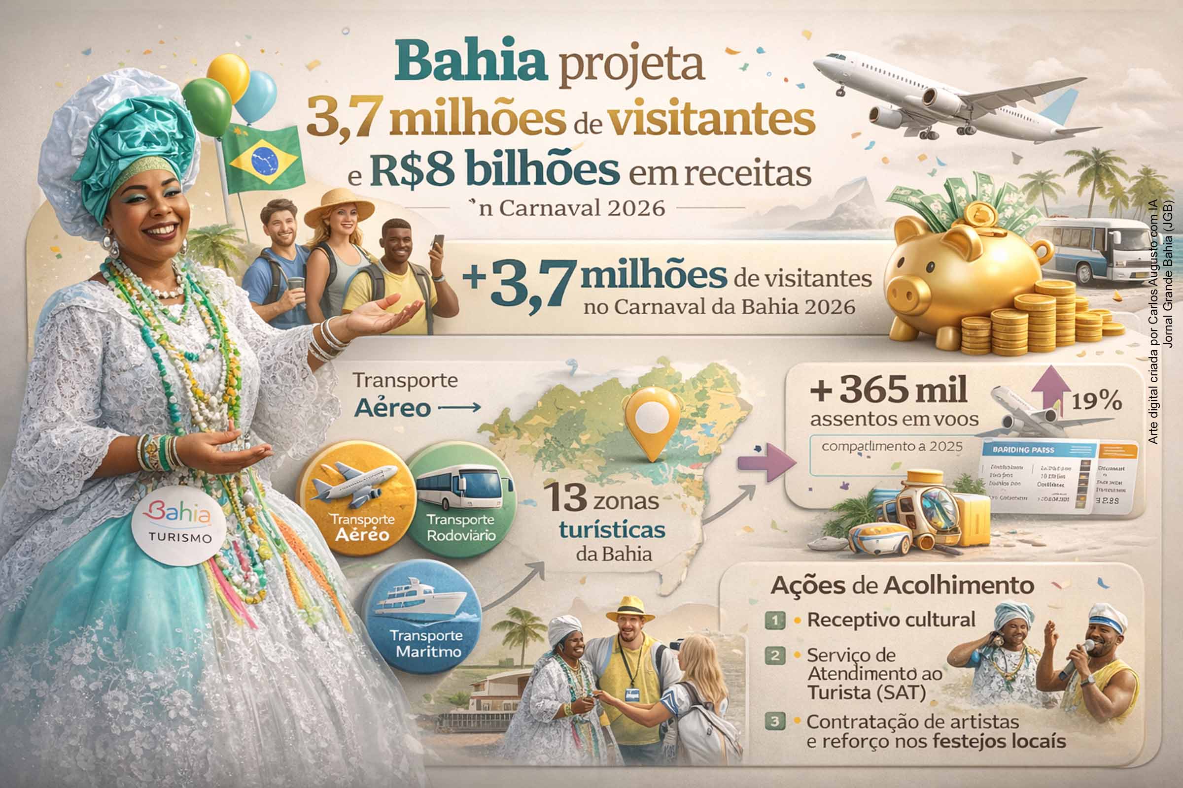 A Secretaria de Turismo da Bahia (Setur-BA) estima que 3,7 milhões de visitantes irão circular pelas 13 zonas turísticas do estado durante o Carnaval da Bahia 2026. A expectativa é de que o fluxo de turistas gere R$ 8 bilhões em movimentação econômica, consolidando a festa como um dos maiores motores de receita do turismo nacional.