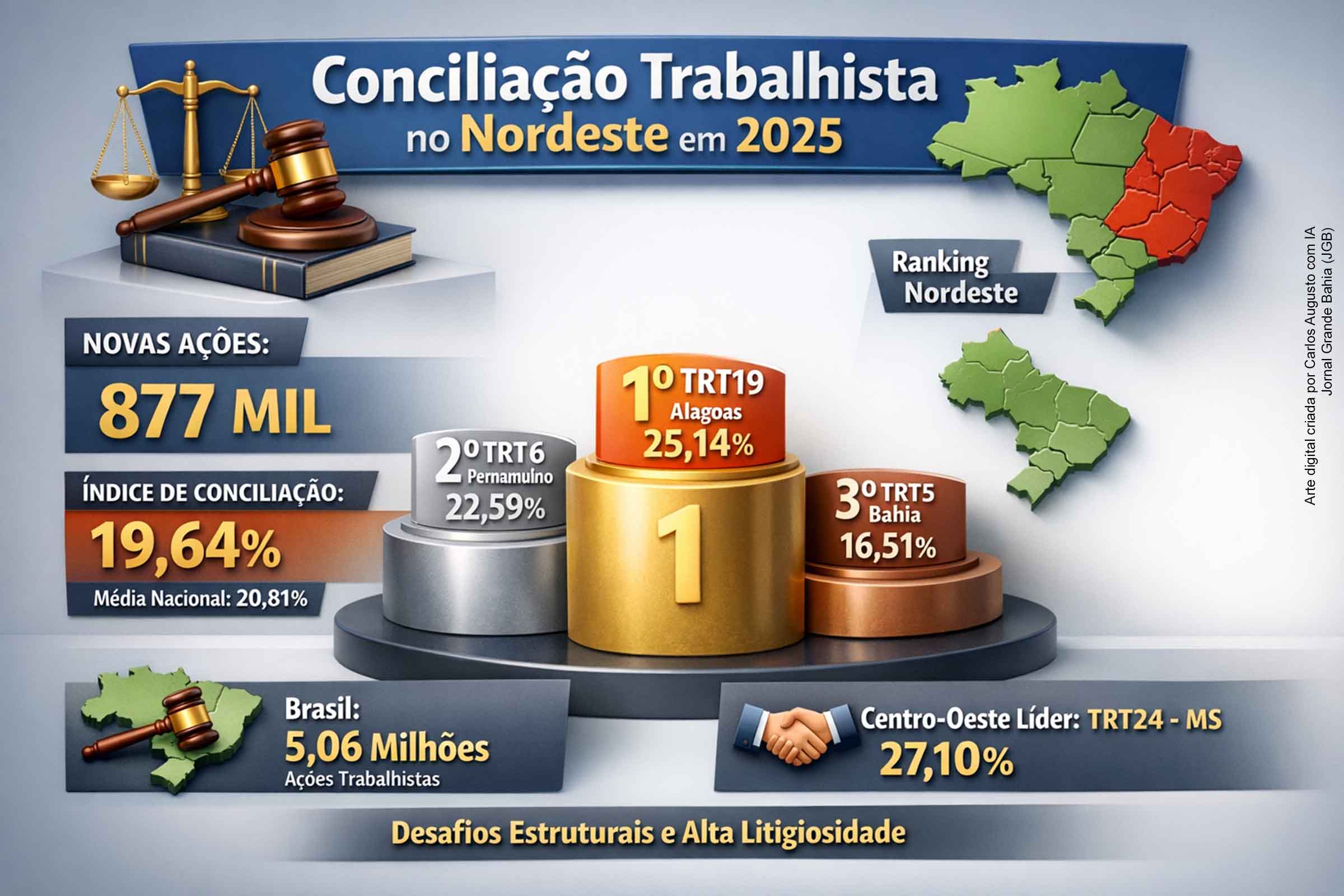 Terça-feira, 10/02/2026 – A Região Nordeste registrou o pior índice de conciliação trabalhista do Brasil nos últimos 12 meses, segundo dados do Conselho Nacional de Justiça (CNJ) referentes ao período entre janeiro e dezembro de 2025. Foram 877.119 novas ações trabalhistas na região, com 138.516 audiências conciliatórias realizadas. O índice de conciliação ficou em 19,64%, abaixo da média nacional de 20,81%, evidenciando dificuldades estruturais para transformar audiências em acordos e reduzir o volume de litígios.