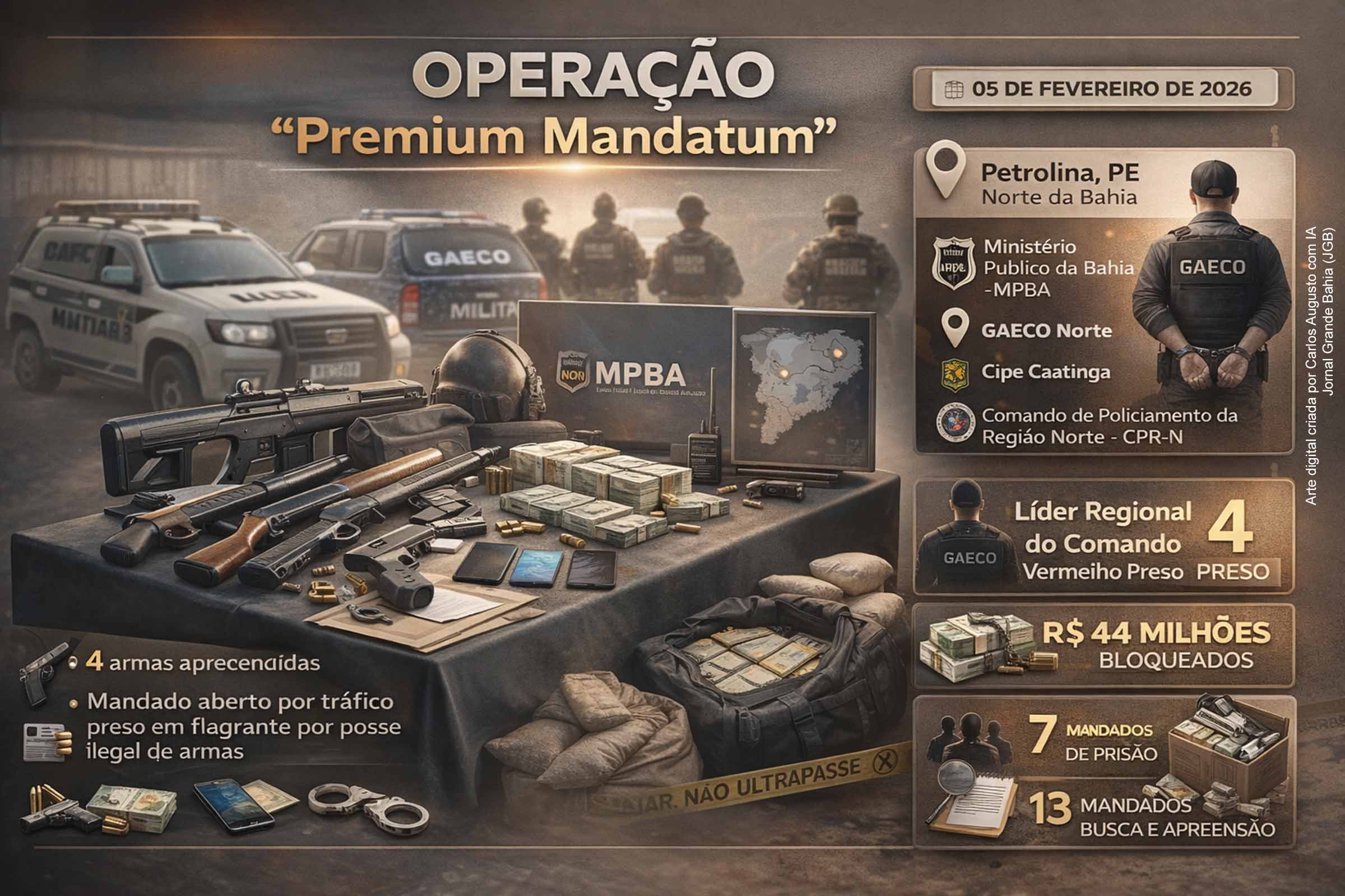 O Ministério Público do Estado da Bahia (MPBA) deflagrou, nesta quinta-feira (05/02/2026), a terceira fase da operação “Premium Mandatum”, no município de Petrolina, em Pernambuco, com foco em integrantes de uma organização criminosa com atuação em Senhor do Bonfim e em outras cidades do norte baiano. Durante a ação, um líder regional do Comando Vermelho foi preso, por força de mandado de prisão em aberto por tráfico de drogas, e também detido em flagrante por posse ilegal de armas, após a apreensão de armamentos e munições em seu poder.