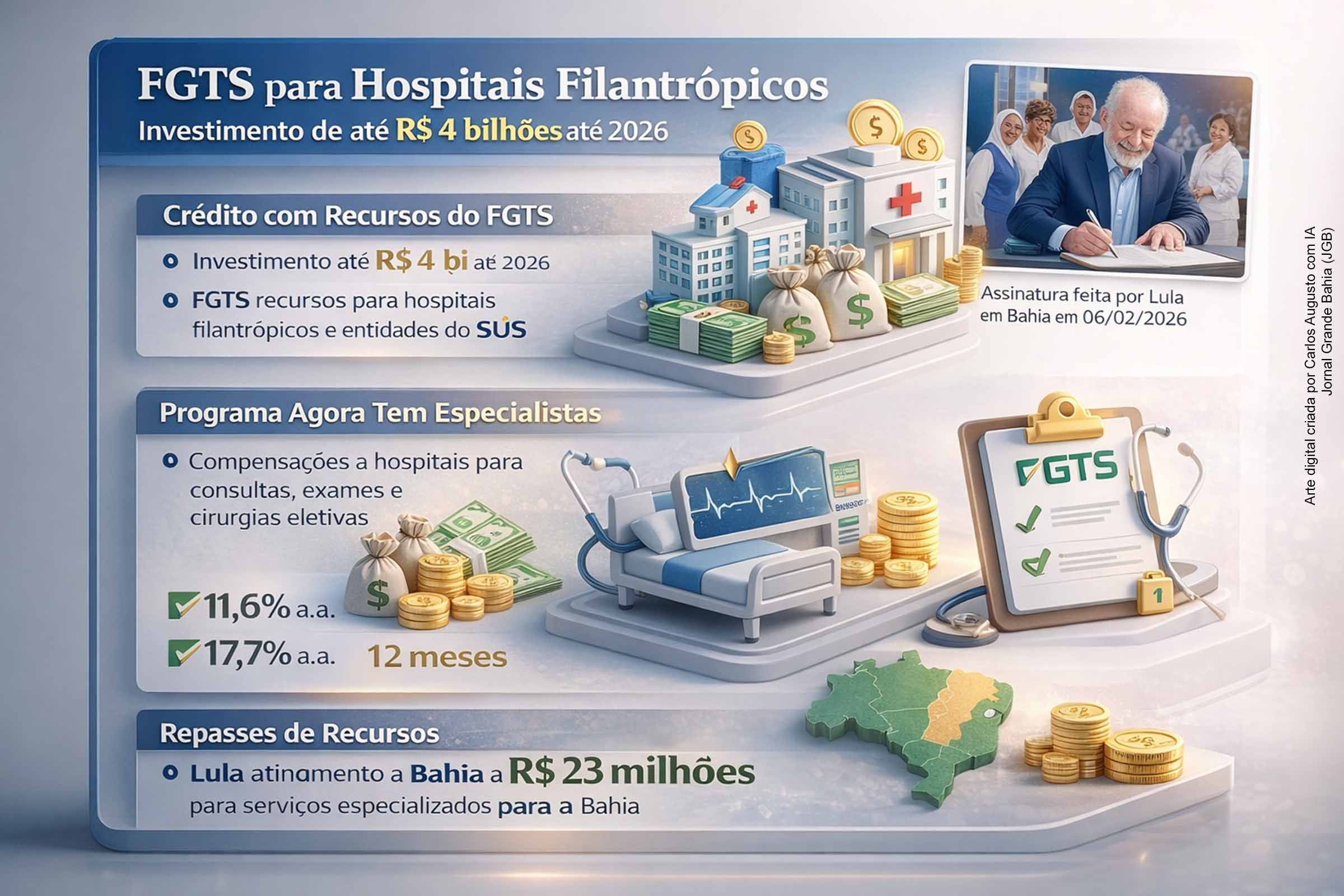 O presidente Luiz Inácio Lula da Silva assinou nesta sexta-feira (06/02/2026) medida provisória que autoriza a destinação de recursos do Fundo de Garantia do Tempo de Serviço (FGTS) para entidades hospitalares filantrópicas, instituições que atuam com pessoas com deficiência e organizações sem fins lucrativos que prestam serviços complementares ao Sistema Único de Saúde (SUS). O anúncio foi feito durante visita às Obras Sociais Irmã Dulce, na capital baiana, onde também foram assinados outros três atos com repasses para a área da saúde.