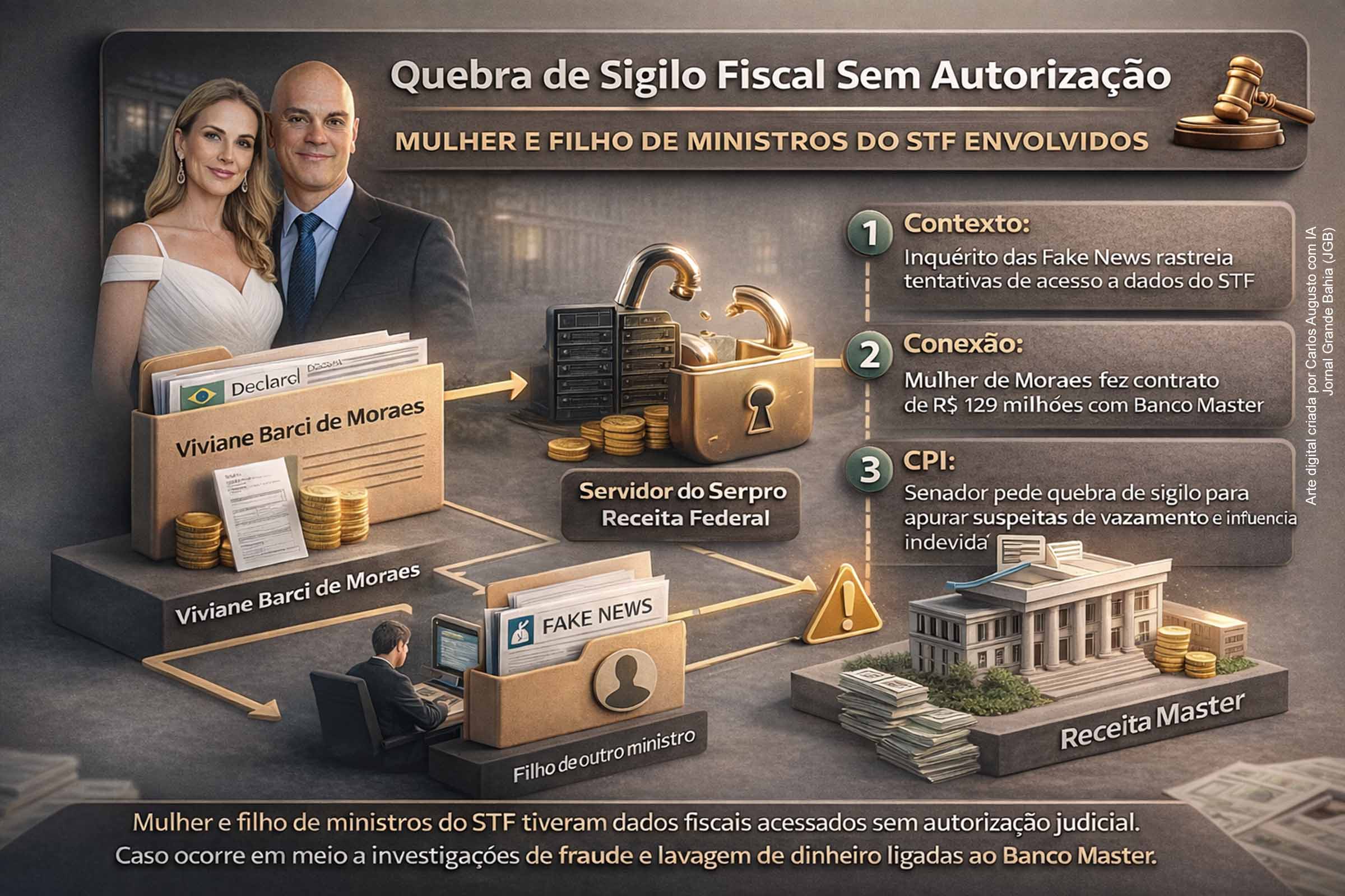 Na segunda-feira (16/02/2026), reportagem publicada pelo site Metrópoles informou que o sigilo fiscal da esposa do ministro do Supremo Tribunal Federal (STF), Alexandre de Moraes, e do filho de outro integrante da Corte foi acessado sem autorização judicial, segundo apuração baseada em registros da Receita Federal. O acesso irregular teria sido realizado por um servidor do Serpro, empresa pública de tecnologia do governo federal, cedido ao órgão fiscal.