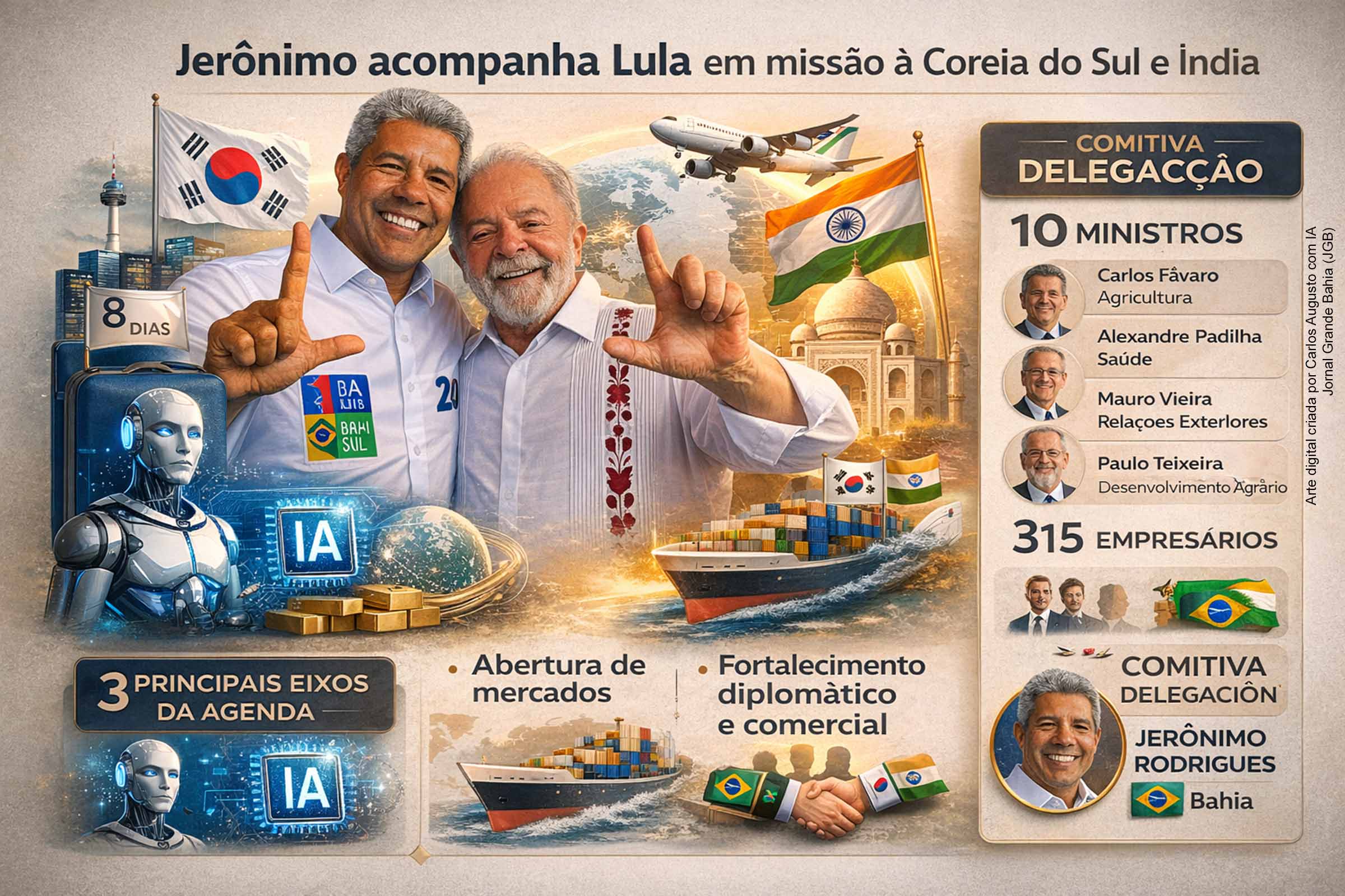 O governador da Bahia, Jerônimo Rodrigues, será o único chefe de Executivo estadual a integrar a comitiva oficial do presidente Luiz Inácio Lula da Silva em viagem à Ásia, que terá duração de oito dias, com previsão de início em 17 de fevereiro de 2026 e incluirá compromissos na Coreia do Sul e na Índia. A delegação brasileira contará ainda com pelo menos 10 ministros de Estado e cerca de 315 empresários, em uma agenda voltada à inteligência artificial, abertura de mercados e fortalecimento das relações comerciais e diplomáticas com as duas potências asiáticas.