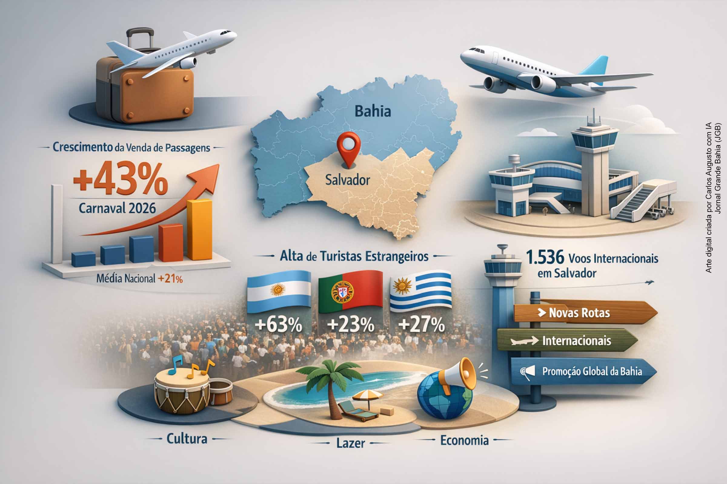 O volume de passagens aéreas internacionais com destino à Bahia para o período do Carnaval de 2026 cresceu 43% em relação ao ano anterior, de acordo com levantamento divulgado em segunda-feira (03/02/2026) pela Embratur. O resultado consolida o estado como um dos principais destinos turísticos do país durante a maior festa popular do mundo e supera com ampla margem a média nacional de crescimento, estimada em 21%. O aumento expressivo reflete a combinação entre tradição cultural, ampliação da conectividade aérea e estratégias consistentes de promoção internacional.