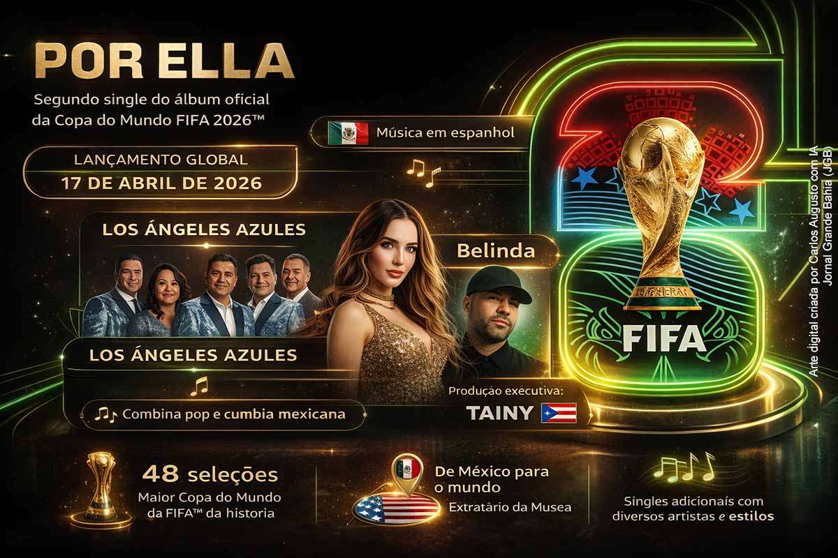 A FIFA deu mais um passo na estratégia musical de divulgação da Copa do Mundo FIFA 2026 com o lançamento nesta sexta-feira (17/04/2026) global de “Por Ella”, segundo single do álbum oficial do torneio. A faixa reúne a cantora Belinda, a banda mexicana Los Ángeles Azules e a produção executiva de Tainy, nome de destaque da música latina contemporânea. Segundo as informações divulgadas, a música e o videoclipe já estão disponíveis nas principais plataformas de streaming e integram um projeto concebido para acompanhar a preparação da maior edição da história do Mundial, agora com 48 seleções.