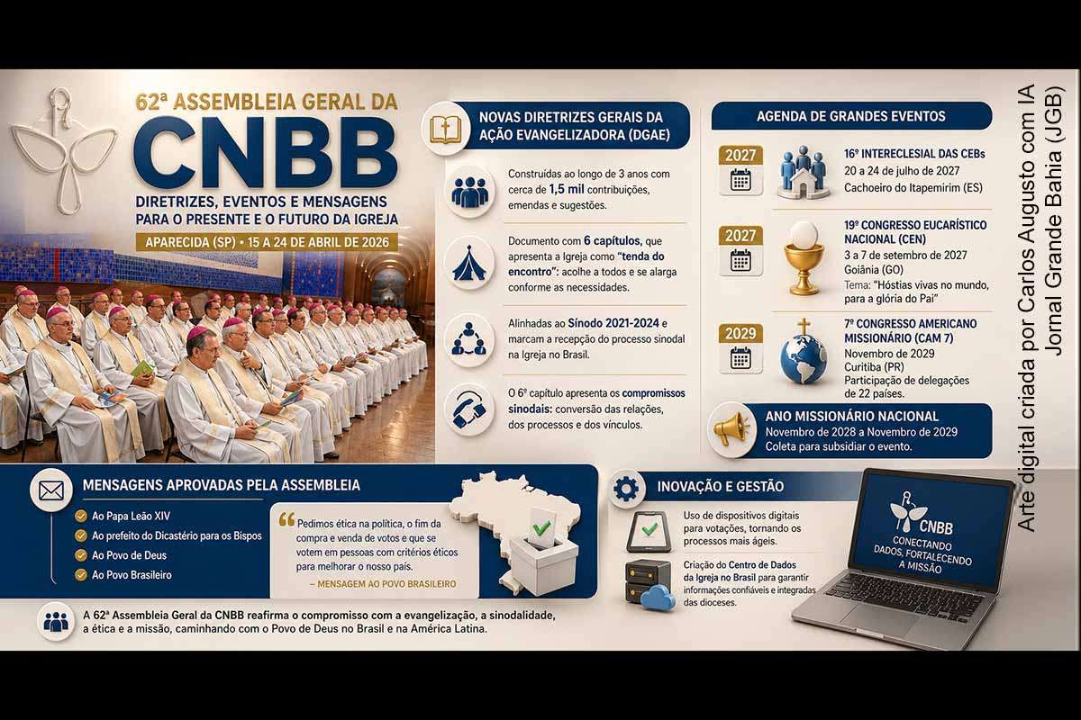 A Conferência Nacional dos Bispos do Brasil (CNBB) encerrou na sexta-feira (24/04/2026), no Santuário Nacional de Aparecida, a 62ª Assembleia Geral, consolidando a aprovação das novas Diretrizes Gerais da Ação Evangelizadora da Igreja no Brasil (DGAE), além de anunciar uma agenda estratégica de eventos nacionais e continentais até 2029 e divulgar mensagens institucionais com ênfase na realidade sociopolítica brasileira.