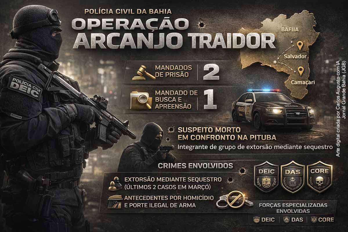 Na manhã desta sexta-feira (17/04/2026), a Polícia Civil da Bahia deflagrou a Operação Arcanjo Traidor, com ações simultâneas em Salvador e no município de Camaçari, com o objetivo de cumprir dois mandados de prisão e um de busca e apreensão contra suspeitos de envolvimento em crimes de extorsão mediante sequestro. A ofensiva foi conduzida pelo Departamento Especializado de Investigações Criminais (Deic), por meio da Delegacia Especializada Antissequestro (DAS), com apoio operacional da Coordenação de Operações e Recursos Especiais (Core).